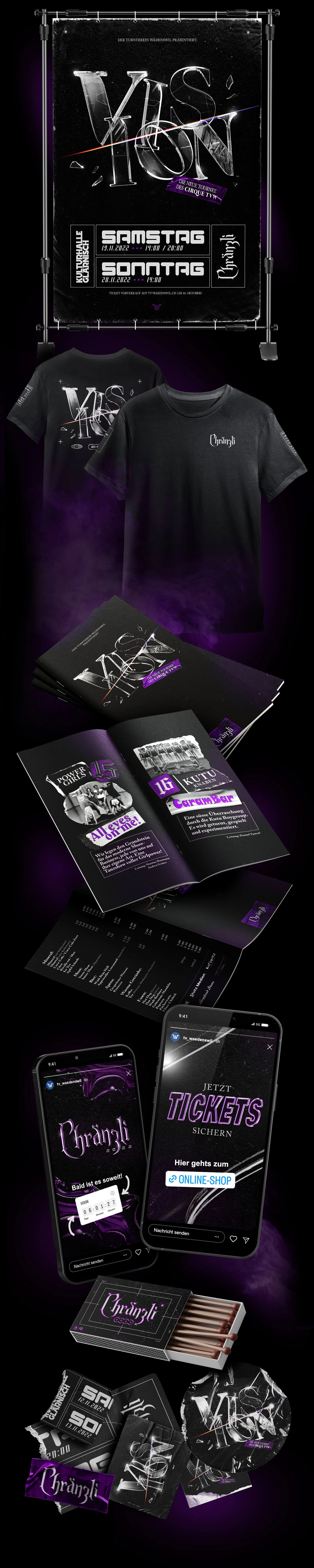 In meiner Position als Creative Director für das Chränzli 2022 des Turnvereins Wädenswil entwickelte ich ein inhaltliches und visuelles Gesamtkonzept, auf dessen Grundlage ich diverse analoge und digitale Werbemittel realisierte. Das Motto "Vision" inspirierte mich Glas, Lichtstrahlen, Chrom sowie die dadurch entstehenden Reflexionen und Kaustiken als zentrale Gestaltungselemente zu verwenden. Ziel war es, eine konsistente, moderne und ästhetische visuelle Identität zu schaffen, die das Event sowie den Verein auf professionelle und ansprechende Weise repräsentiert. Alle Gestaltungselemente sollten außerdem vielseitig angepasst und eingesetzt werden können. Daraus folgte die Gestaltung eines Logos und Keyvisuals, die als Basis für Plakate, Faltprogramme, animierte Videosequenzen und Social-Media-Inhalte dienten. Rückblickend war das Projekt ein großer Erfolg welches dazu beitrug, das Chränzli des Turnvereins Wädenswil zu einem unvergesslichen Erlebnis zu machen. Ich bin nach wie vor sehr dankbar und stolz, bei solch einem traditionsreichen Event mitwirken zu dürfen.